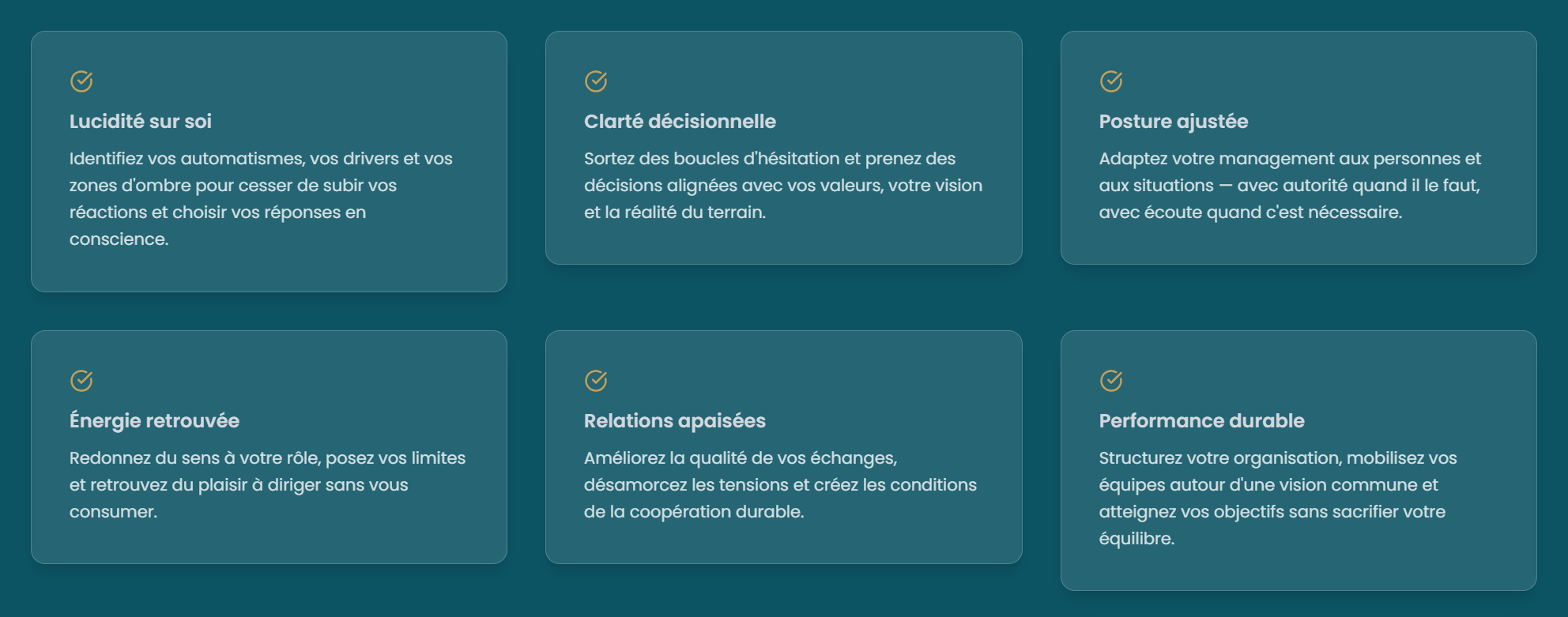 Ma spécificité réside dans cet accompagnement à double casquette : j'interviens aussi bien sur la fluidité collective des équipes que sur le développement individuel des dirigeants et managers.
